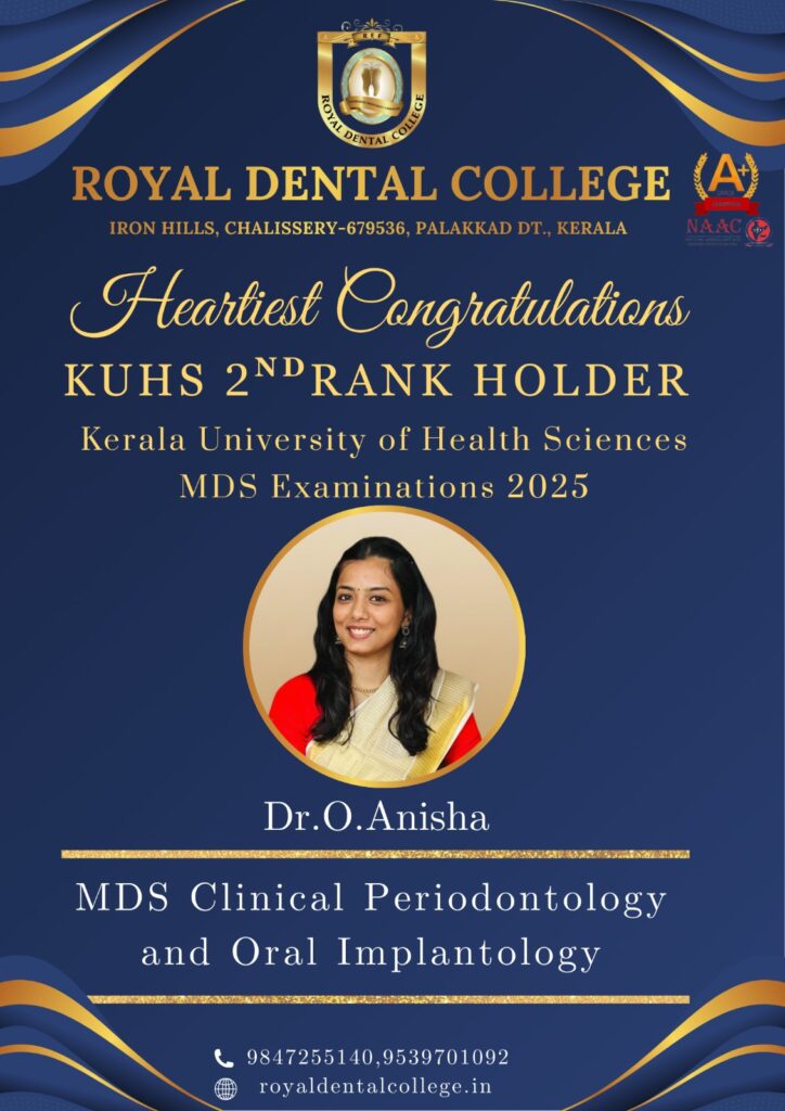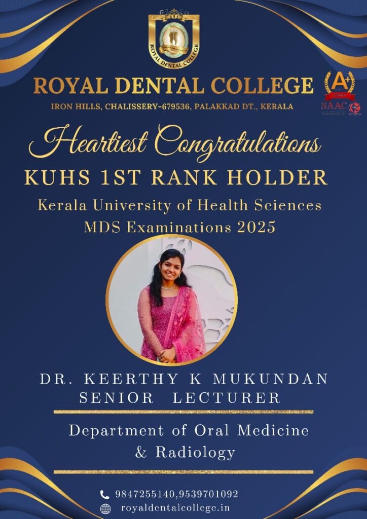 First Rank Holder, MDS Prosthodontics and crown and Bridge Royal Dental College, Chalissery